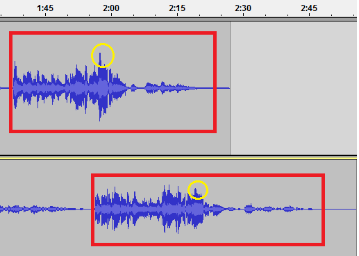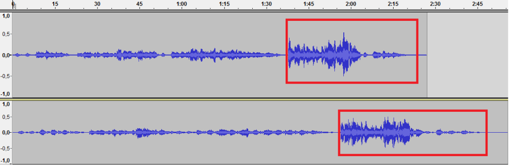 Se aprecia con claridad la gran diferencia en cuanto a la amplitud en las formas de onda de ambas grabaciones,y por ende de dinámicas, justo en el momento en el que empiezan los últimos 8 compases de la interpretación vocal. Cabe señalar además, que el punto climático dentro de estas secciones coincide con la expresión de la palabra en cuestión, marcada en amarillo en la siguiente imagen: