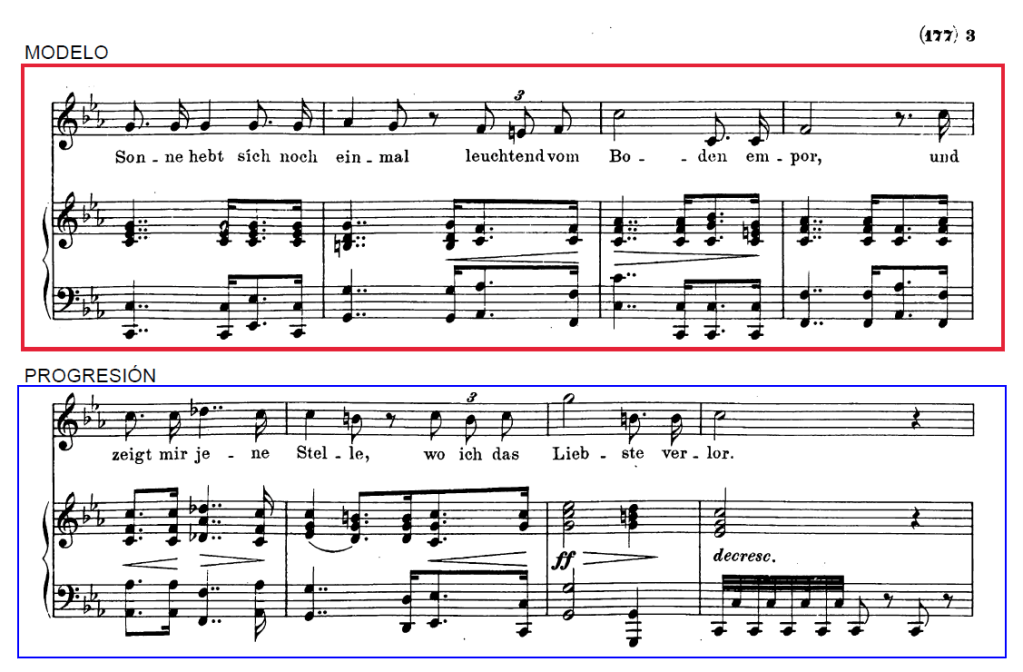 No se trata de una progresión ni tan siquiera modulante, ya que el fragmento entero se encuentra en do menor, pero lo cierto es que el modelo descansa sobre un Do blanca (3er compás), aunque armonizado sobre un IV, no un I. Que tiene su alter ego en la progresión sobre el Sol del que estamos hablando. Este hecho, establece una serie de relación antitética de estabilidad-inestabilidad, cuya dinámica tensiona el sonido sobre la palabra Liebste.
