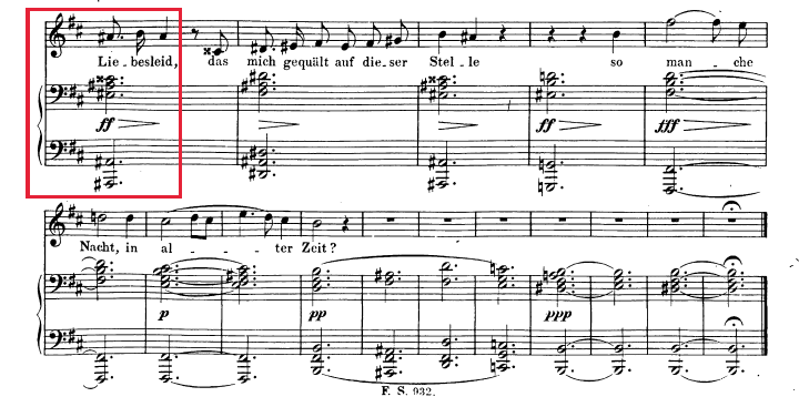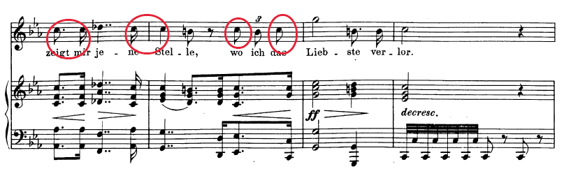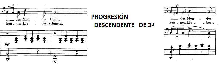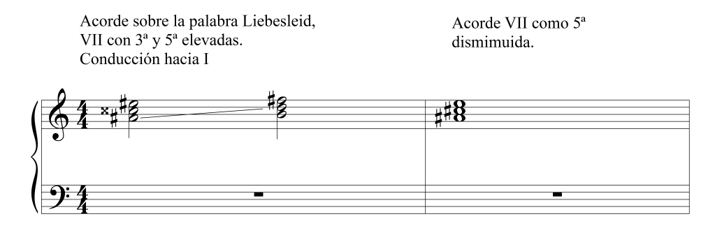 Cabe destacar además, la progresión que tiene lugar justo en el compás en el que aparece el término Liebesschmerz y siguiente, más el par siguiente (en el que se vuelve a repetir la palabra):