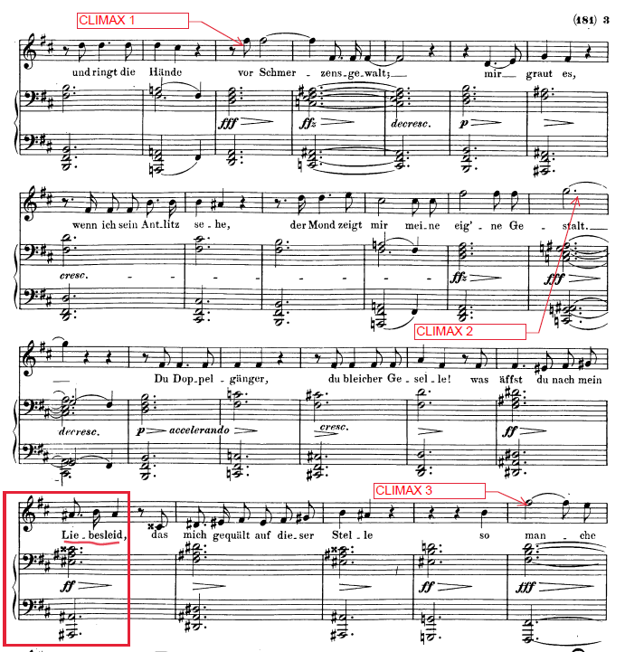A nivel dinámico, nos encontramos en el peldaño previo al tercer punto climático de la pieza. Que tendrá lugar 4 compases más tarde, justo antes de una bajada súbita a piano, pianissimo y así hasta llegar a la extinción del sonido. En uno de los fragmentos probablemente más dramáticos de la amplia producción de Lieder de Schubert (lo cual ya es decir, por cierto…). En este caso, ese peldaño del que hablamos forma parte de un proceso que arrancó hace cuatro compases, después del primer punto climático de la pieza.