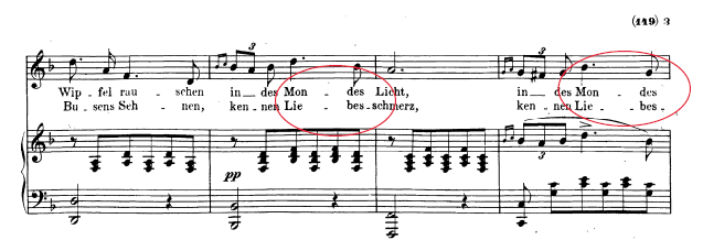 A priori, la musicalización del texto no nos dice nada en especial. Ya que no se ubica en un ámbito o registro llamativo ni extremo a nivel de puntas melódicas, tampoco se destaca a nivel dinámico o plantea un cambio en el acompañamiento. Pero, hay un hecho muy importante: se trata del primer Do natural que aparece en la partitura. Puesto que hasta ese momento, todos los anteriores eran sostenido, ya que la pieza está escrita en re menor. Por si esto no fuera suficiente, ese Do aparece triplicado con la octava doble en el bajo del piano y el canto. De esta forma, se ubica como el acorde de dominante para modular a Fa M, tonalidad del relativo mayor; modulación que se confirma en el siguiente compás con la aparición del acorde de Fa. Por lo tanto, el tratamiento armónico dado a la palabra Liebchen es cuando menos particular, dado que se subraya mediante un acorde con un sentido gramatical y morfológico bastante potente. ¿Casualidad? Puede ser…pero el hecho es el que acabamos de explicar.