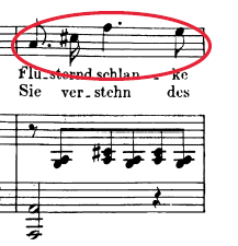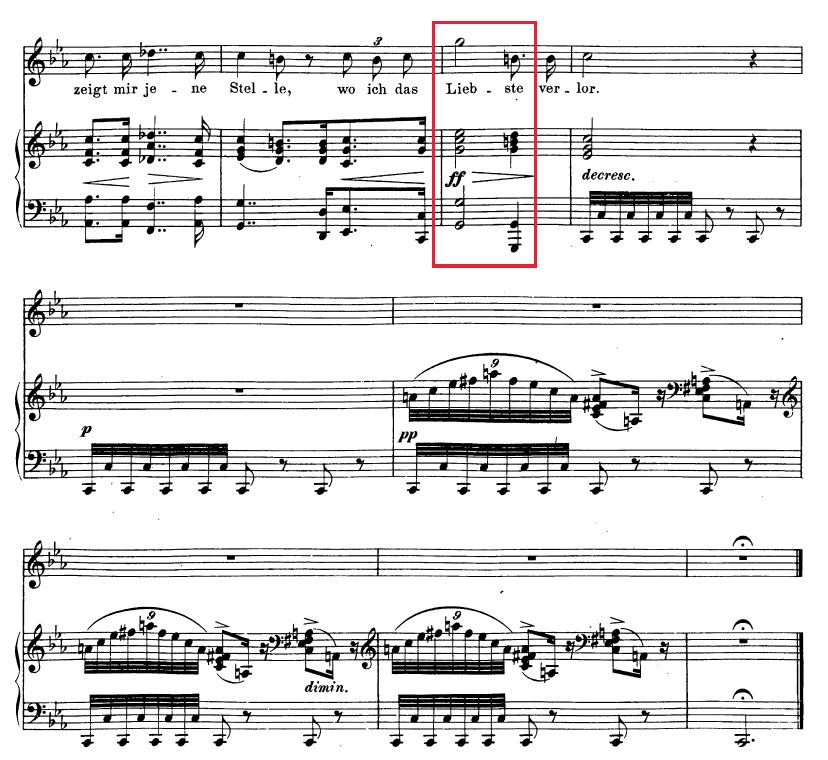 Así es que en torno a esta palabra, Liebesschmerz (mal de amor, recordemos), suceden al menos tres cosas: cambio de dinámica, aceleración rítmica, y sonoridad armónica no convencional derivada de la progresión descendente y de la sonoridad de la 5ª disminuida. Por lo tanto, la realidad es que la musicalización con la que se reviste no es precisamente anodina…