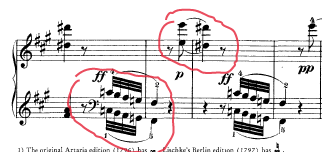 Otro aspecto que resulta cuando menos llamativo, es que precisamente en este espacio de codetta, los materiales motívicos utilizados no nos recuerdan de manera tan clara a los del inicio de la sonata, veamos:
