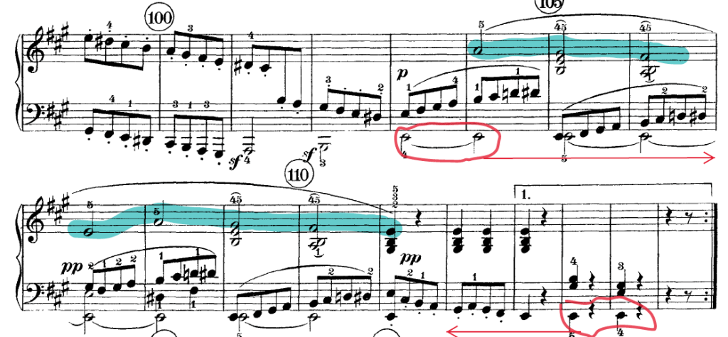 En azul cian hemos marcado la línea melódica superior, en la que se aprecia una clara direccionalidad cadencial: La↓Sol#↓Fa#↓Mi. En la voz del bajo apreciamos la persistencia de la nota Mi, tónica de Mi M, tonalidad del tema B, y al mismo tiempo dominante estructural del 1er tiempo, que sirve para preparar la vuelta a La M. Estos rasgos (junto a otros posibles, obviamente) funcionan en el pasaje como inputs generadores de una sonoridad con una función acusticoformal evidente, inherente a cualquier codetta. Inputs que no apreciamos en el compás 76, en el momento en el que aparece el material coincidente con el tema A.