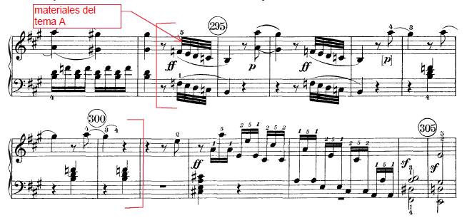 Un hecho a destacar, y que confirma la importancia de la reinserción de este material correspondiente al tema A, es que en la recapitulación lo volvemos a encontrar. Así, en la equivalencia de los compases 76 al 83 en la reexposición (compases 295 al 302) vemos lo siguiente: