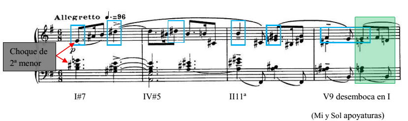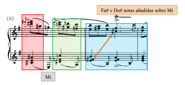 Toda esta inestabilidad armónica se resuelve en parte, en el elemento marcado en azul, que funciona como un primer grado de Mi sin tercera con notas añadidas (2ª y 6ª Fa# y Do# respectivamente) hasta la presentación final del acorde con 3ª y 7ª.