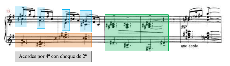 Por su parte, el tercer acorde que era una superposición de quintas justas, en cierto modo se disocia en dos. Presentando primero Do#-Sol# y después Fa#-Do#. De todas formas, el intervalo de quinta justa ya está funcionando previamente, tal como hemos señalado con la línea discontinua, con las notas Do-Sol. Por último, dentro de estos compases tenemos un acorde por cuartas (marcado en amarillo) con las notas Re#-Sol#-Do#, que pueden entenderse como una inversión de una superposición por 5as justas: