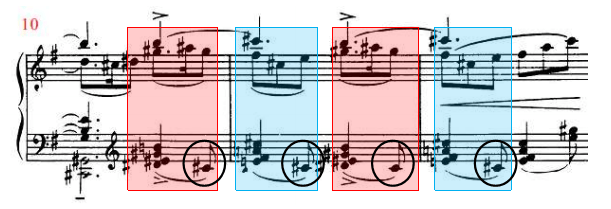 De nuevo asistimos a la alternancia de dos elementos y de nuevo el primero de ellos, a pesar de la ligadura, se puede disociar armónicamente como dos subdominantes diferenciadas. El marcado en rojo es un acorde de La menor (Si#=Do) con 4ª añadida, que desemboca en un acorde perfecto mayor de Fa#. En relación con el centro tonal del final de la obra Mi, se trata pues de dos subdominantes: IV y II respectivamente. Justo la nota que aparece en el bajo en el II grado es un La#, a distancia de tritono del siguiente Mi, base del elemento marcado en azul. Que no deja de ser un primer grado con 7ª y 9ª, si bien en la última corchea aparecen Si y Re sostenido como ampliaciones cromáticas de las mismas notas.