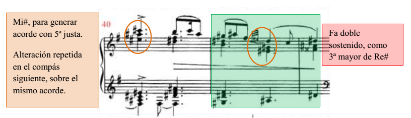 Más adelante, entre los compases 38-42 y 42-46 (como reelaboración del fragmento 38-42 una octava grave) la música modula a un nuevo centro tonal: Re#. Centro tonal que se puede llegar a considerar como Re# frigio (modo de Mi), salvo por la presencia puntual de las notas Mi# y Fa doble sostenido. De todas formas, estas notas se justifican como elementos colorísticos; bien sea como notas (o acordes de apoyatura) bien sea como notas alteradas para conseguir una estructura acórdica concreta. Presentamos y analizamos a continuación el fragmento de los c.c. 40-42.