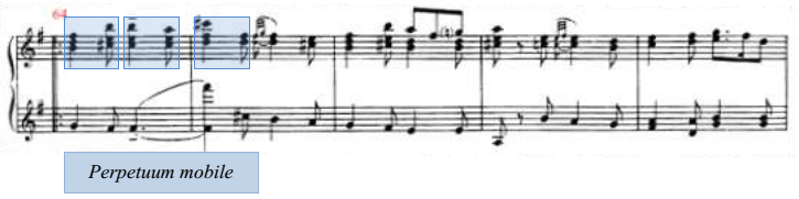 Dentro de esta tercera parte, los compases 132 y 133 funcionan como un modelo a partir del cual se derivan dos progresiones por segunda descendente en los c.c. 134-135 y 136-137 (si bien aquí se amplía el intervalo como 9ª y se replantea la armonía). Finalmente, los compases 138 y 139 funcionan como una codetta para cadenciar en Mi.