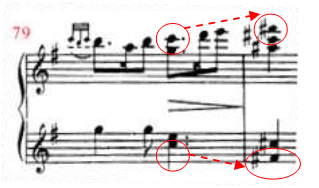 En cuanto a la reelaboración del primer fragmento entre los compases 42 y 46, merece ser comentada. Empieza como una repetición a la octava grave de la voz superior previa, pero con un cambio del sustrato armónico. Además, tiene lugar un hecho muy interesante: al final es modificada para presentar una cadencia no sobre Re#, sino sobre Fa#, a modo de modulación: