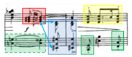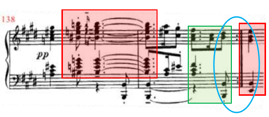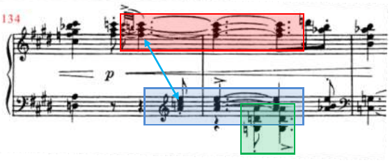 En rojo señalamos el primer acorde que aparece, perfecto mayor sobre Fa (Fa-La-Do). En azul señalamos el segundo acorde, perfecto menor de La (La-Do-Mi) que enlazaría a partir de un choque de segunda menor entre el Fa del primer acorde y el Mi quinta del segundo. Choque armónico que se deriva del gesto comentado, sito en el inicio de la segunda parte (compás 124). Por último, señalamos en verde el último acorde, que no es más que una superposición de quintas justas hacia abajo (La¦Re¦Sol) desde la nota más grave del segundo acorde. Por lo tanto, tiene lugar una mixtura de tres acordes.