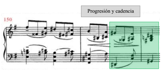 Esta alternancia de acordes nos conduce mediante una progresión y rearmonización en los compases 151 y 152, a una clara cadencia sobre un acorde de Sol# m. Que nos recuerda a una cadencia sobre Sol# (aunque mayor) que tuvo lugar en el compás 17. Veamos los dos fragmentos: