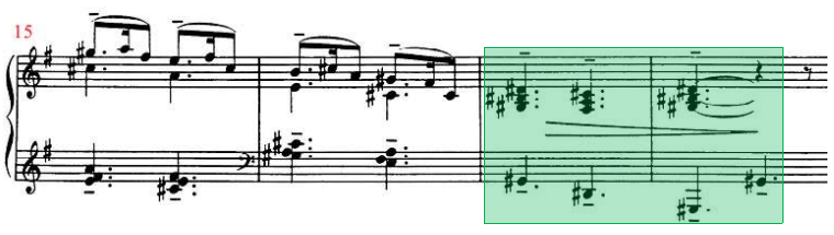 El elemento marcado en verde puede entenderse como otro acorde construido sobre Re#, una acorde de 7ª disminuida con la 3ª rebajada. Si bien, es cierto que algunos sonidos escaparían a esa consideración como notas extrañas. Resulta llamativo el nivel de disonancia del acorde, motivado por los choques de las notas extremas Re# y Mi.